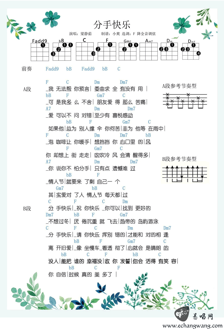 分手快乐ukulele谱 梁静茹 尤克里里谱 图片谱 曲谱类型: 弹唱伴奏谱 编配来源: 心忆 演唱(奏):梁静茹 发布于:2017-06-12 点击: 次 曲谱归类: 梁静茹 梁静茹分手快乐尤克里里谱,选调F,降全音调弦,分手快乐尤克里里谱,乌克丽丽编配弹唱谱,和弦节奏型参考图片标注。感谢心忆小爽制谱,易唱网上传。 * 网站内容自网络收集整理而来,仅供爱好者学习交流,版权归其原作者,若侵犯了您的合法权利,请与我们联系,我们将立刻处理。 上一篇:房间ukulele谱 刘瑞琦 房间吉他谱+尤克里里谱 下一篇:We Don't Talk Anymore ukulele谱 尤克里里弹唱谱 优客张SIR 心动小U 马叔叔教乌克丽丽 鱼仔超人 玛佧音乐 四弦公社 小Sa神 ukulele狂热 强尼的乌克丽丽 摩卡音乐 尤克宝贝 小鱼吉他屋 弹吧小吉他 相关吉他谱