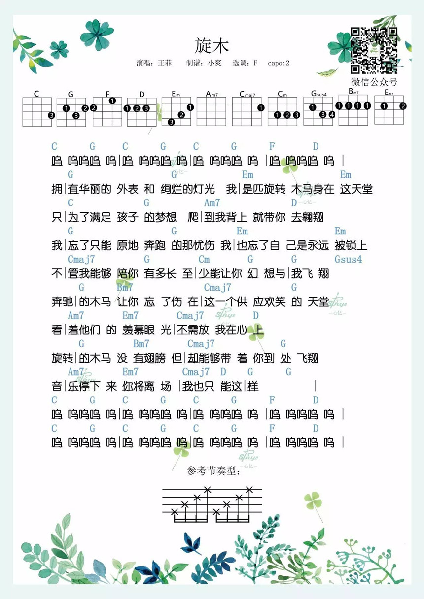 旋木ukulele谱 王菲《旋木》尤克里里谱 曲谱类型: 弹唱伴奏谱 编配来源: 心忆尤克里里 演唱(奏):王菲 发布于:2017-06-16 点击: 次 曲谱归类: 王菲 王菲旋木ukulele谱,变调夹夹二品,袁惟仁的代表作品,旋木尤克里里谱,和弦编配,参考节奏型参见图片谱。感谢小爽制谱,易唱网上传。 * 网站内容自网络收集整理而来,仅供爱好者学习交流,版权归其原作者,若侵犯了您的合法权利,请与我们联系,我们将立刻处理。 上一篇:安和桥尤克里里谱 宋冬野/薛之谦 ukulele弹唱教学视频 下一篇:走着走着就散了ukulele谱 庄心妍 尤克里里谱 C调弹唱 优客张SIR 心动小U 马叔叔教乌克丽丽 鱼仔超人 玛佧音乐 四弦公社 小Sa神 ukulele狂热 强尼的乌克丽丽 摩卡音乐 尤克宝贝 小鱼吉他屋 弹吧小吉他 相关吉他谱 旋木ukulele谱_袁惟仁/王菲_旋木尤克里里谱