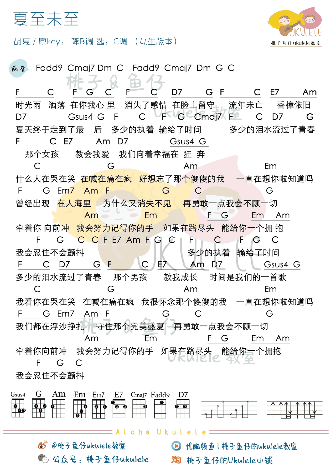 夏至未至尤克里里弹唱谱,电视剧《夏至未至》同名主题曲,胡夏演唱,夏至未至ukulele谱,感谢桃子鱼仔为琴友们准备了两个编配版本,G调男生版和C调男生版,大家可以参照和弦节奏型建议练习。