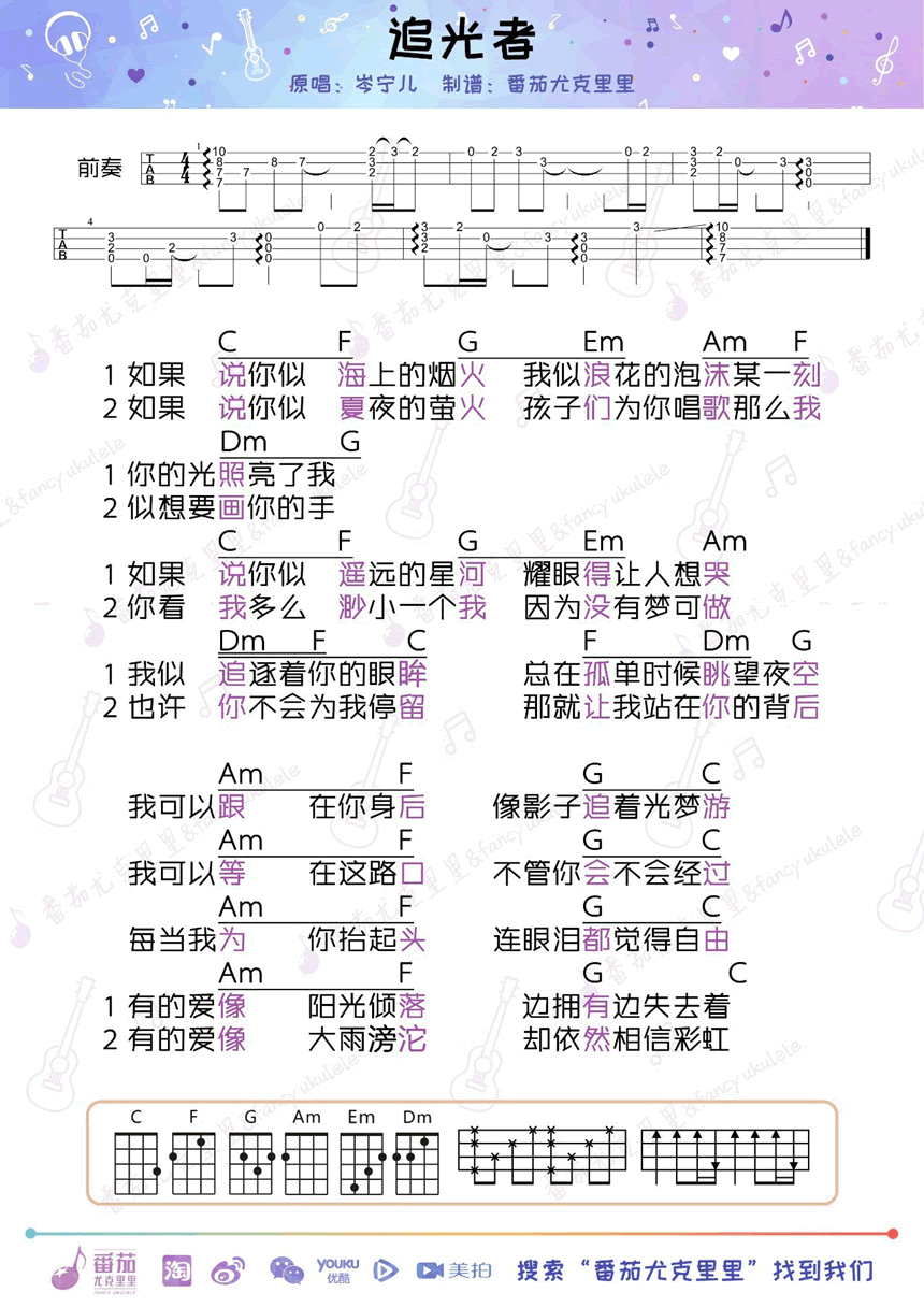 追光者尤克里里谱 岑宁儿 追光者ukulele谱 曲谱类型: 弹唱伴奏谱 编配来源: 番茄尤克里里 演唱(奏):岑宁儿 发布于:2017-06-23 点击: 次 曲谱归类: 影视主题曲 岑宁儿《追光者》ukulele谱,根据郭敬明同名小说改编的电视剧《夏至未至》片尾曲,追光者尤克里里谱,带四线谱前奏,和弦节奏型建议参考见图片谱。感谢番茄尤克里里编配,易唱网上传分享。 * 网站内容自网络收集整理而来,仅供爱好者学习交流,版权归其原作者,若侵犯了您的合法权利,请与我们联系,我们将立刻处理。 上一篇:夏至未至尤克里里谱 胡夏《夏至未至》主题曲 ukulele谱 下一篇:我怀念的尤克里里谱 孙燕姿 我怀念的ukulele谱 优客张SIR 心动小U 马叔叔教乌克丽丽 鱼仔超人 玛佧音乐 四弦公社 小Sa神 ukulele狂热 强尼的乌克丽丽 摩卡音乐 尤克宝贝 小鱼吉他屋 弹吧小吉他 相关吉他谱 凉凉ukulele指弹谱_尤克里里教学视频_三生三世十里桃花片尾曲 夏至未至尤克里里谱 胡夏《夏至未至》主题曲 ukulele谱 蚯蚓尤克里里谱 杨紫《欢乐颂2》插曲 ukulele谱 陪你度过漫长岁月 尤克里里谱 陈奕迅 ukulele谱 我们的明天尤克里里谱 鹿晗 尤克里里谱 弹唱谱 有点甜ukulele谱 汪苏泷《微微一笑很倾城》插曲 弹唱谱 老狼/任素汐《我要你》ukulele谱 尤克里里谱 弹唱教学视频 吴亦凡《从此以后》ukulele谱_尤克里里谱女生版 周深《大鱼》ukulele谱_动画电影《大鱼海棠》尤克里里谱