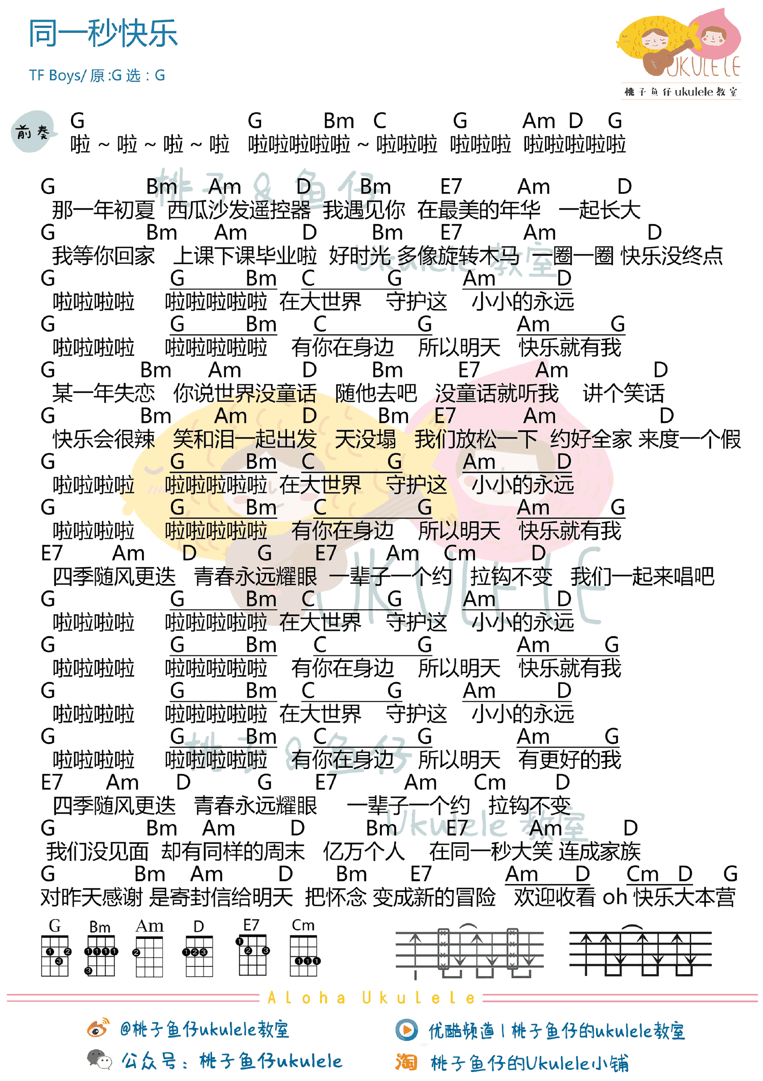 同一秒快乐ukulele谱 TFBOYS《同一秒快乐》尤克里里教学 曲谱类型: 弹唱伴奏谱 编配来源: 桃子鱼仔 演唱(奏):TFBOYS 发布于:2017-07-08 点击: 次 曲谱归类: TFBOYS TFBOYS《同一秒快乐》尤克里里谱,G调弹唱谱,湖南卫视《快乐大本营》20周年主题曲,同一秒快乐ukulele谱,女声可用变调夹夹2品弹唱,桃子鱼仔编配,和弦节奏型参考图片谱。随谱附上《同一秒快乐》尤克里里教学视频,方便琴友们练习。 * 网站内容自网络收集整理而来,仅供爱好者学习交流,版权归其原作者,若侵犯了您的合法权利,请与我们联系,我们将立刻处理。 上一篇:清白之年ukulele谱 朴树 清白之年尤克里里谱 下一篇:没有了 优客张SIR 心动小U 马叔叔教乌克丽丽 鱼仔超人 玛佧音乐 四弦公社 小Sa神 ukulele狂热 强尼的乌克丽丽 摩卡音乐 尤克宝贝 小鱼吉他屋 弹吧小吉他 相关吉他谱 王源《长大以后的世界》尤克里里谱_王源ukulele谱 不完美小孩ukulele谱_TFBoys_尤克里里弹唱教学示范 青春修炼手册ukulele谱_TFBOYS_马叔叔尤克里里教学