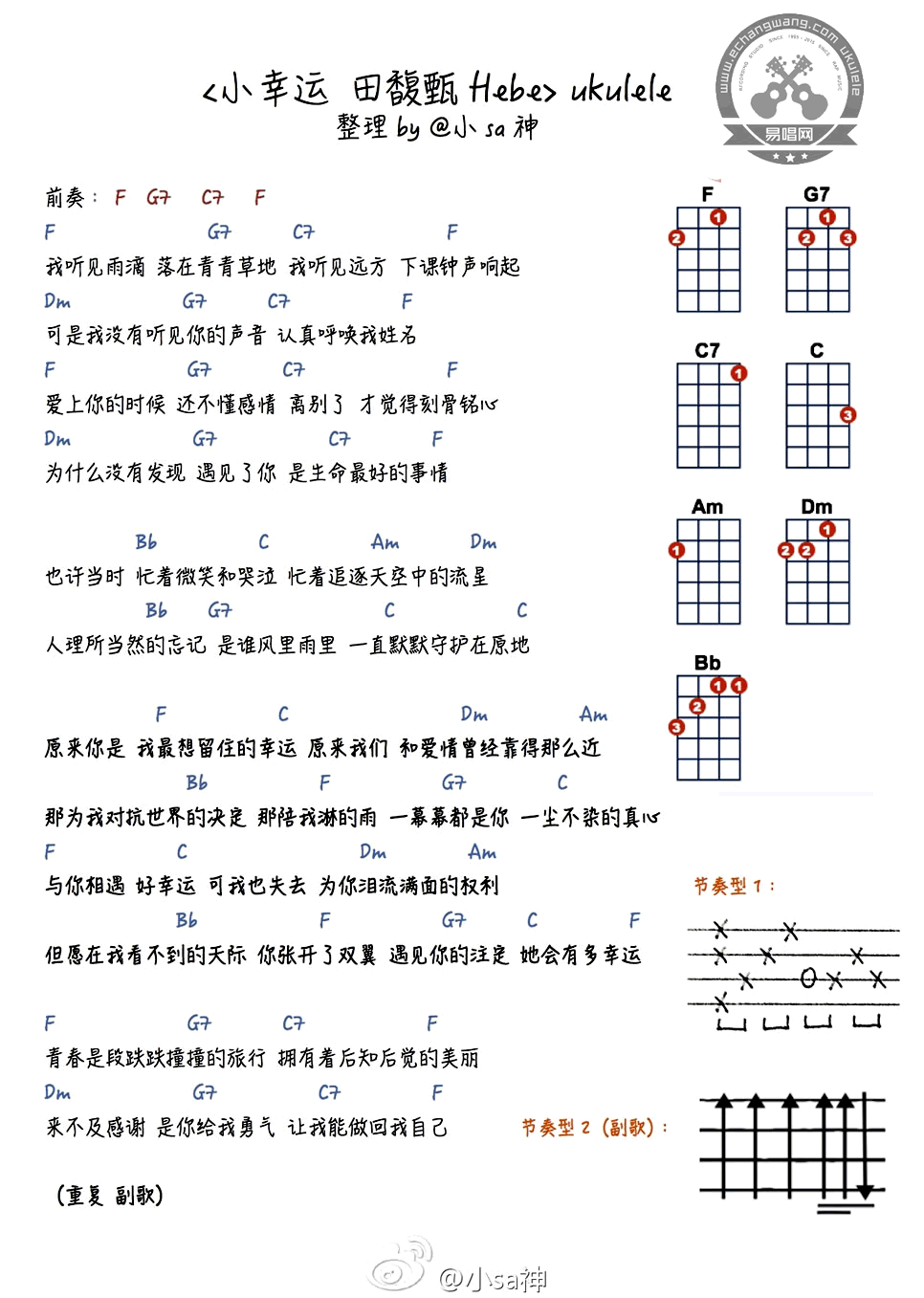 小幸运ukulele谱 田馥甄《小幸运》尤克里里弹唱 教学视频 曲谱类型: 弹唱伴奏谱 编配来源: 小Sa神 演唱(奏):田馥甄 发布于:2017-07-06 点击: 次 曲谱归类: 田馥甄 小幸运ukulele谱,田馥甄演唱,台湾电影《我的少女时代》主题曲,小幸运尤克里里谱,清新动听的歌声,让人回忆自己曾经的青涩而美丽的初恋,本曲谱为小Sa神乌克丽丽编配,和弦与节奏参见图片谱,随谱附上《小幸运》ukulele弹唱教学视频。 * 网站内容自网络收集整理而来,仅供爱好者学习交流,版权归其原作者,若侵犯了您的合法权利,请与我们联系,我们将立刻处理。 上一篇:曾经的你尤克里里谱 许巍 ukulele谱 弹唱谱 下一篇:原来的我尤克里里谱_齐秦_原来的我ukulele谱 优客张SIR 心动小U 马叔叔教乌克丽丽 鱼仔超人 玛佧音乐 四弦公社 小Sa神 ukulele狂热 强尼的乌克丽丽 摩卡音乐 尤克宝贝 小鱼吉他屋 弹吧小吉他 相关吉他谱 小幸运吉他谱 田馥甄 C调高清弹唱谱 图片谱 小幸运吉他谱_C调原版六线谱_田馥甄吉他谱 小幸运吉他谱_C调简单版_田馥甄《我的少女时代》主题曲 小幸运尤克里里指弹谱_田馥甄_ukulele独奏谱