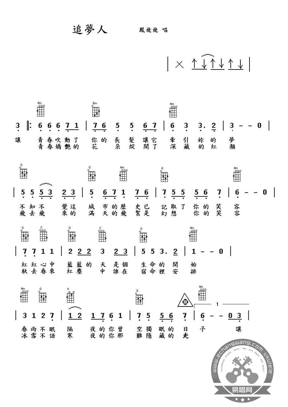 追梦人ukulele谱 凤飞飞 尤克里里谱 弹唱谱 曲谱类型: 弹唱伴奏谱 编配来源: 网络 演唱(奏):凤飞飞 发布于:2017-06-14 点击: 次 曲谱归类: 凤飞飞 追梦人尤克里里谱,凤飞飞的一首经典华语流行歌曲,罗大佑为女作家三毛离世而有感创作,台湾电视连续剧《雪山飞狐》的片尾曲,追梦人ukulele谱,乌克丽丽编配图片谱,易唱网尤克里里曲谱专栏搜集上传。 * 网站内容自网络收集整理而来,仅供爱好者学习交流,版权归其原作者,若侵犯了您的合法权利,请与我们联系,我们将立刻处理。 上一篇:宁夏ukulele谱_梁静茹_宁夏尤克里里谱 下一篇:菊花台尤克里里谱_周杰伦ukulele谱(图片谱) 优客张SIR 心动小U 马叔叔教乌克丽丽 鱼仔超人 玛佧音乐 四弦公社 小Sa神 ukulele狂热 强尼的乌克丽丽 摩卡音乐 尤克宝贝 小鱼吉他屋 弹吧小吉他 相关吉他谱 追梦人吉他谱C调简单版_凤飞飞_弹唱谱高清版 追梦人ukulele谱_凤飞飞_尤克里里弹唱教学