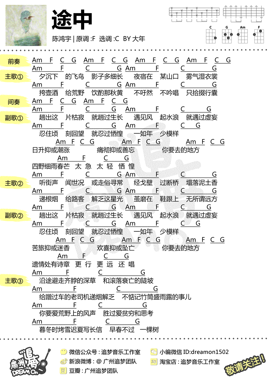 途中ukulele谱 陈鸿宇《途中》尤克里里谱_男生版+女生版 曲谱类型: 弹唱伴奏谱 编配来源: 梦马音乐 演唱(奏):陈鸿宇 发布于:2017-09-18 点击: 次 曲谱归类: 途中尤克里里谱,陈鸿宇民谣创作歌曲,途中ukulele谱,C调女生版和G调男生版两张图片谱,,感谢大年编配,易唱网上传分享。踏上一段未知的路程,迷茫的不知该如何前进,陈鸿宇的演绎更像是一个叙事者,不太多个人添加。简简单单,真真实实,把最初的原始故事告诉你。 听到的什么那就是什么。 * 网站内容自网络收集整理而来,仅供爱好者学习交流,版权归其原作者,若侵犯了您的合法权利,请与我们联系,我们将立刻处理。 上一篇:给我一首歌的时间ukulele谱 周杰伦 尤克里里教学视频 下一篇:心墙ukulele谱 郭静 心墙尤克里里谱 弹唱教学视频 优客张SIR 心动小U 马叔叔教乌克丽丽 鱼仔超人 玛佧音乐 四弦公社 小Sa神 ukulele狂热 强尼的乌克丽丽 摩卡音乐 尤克宝贝 小鱼吉他屋 弹吧小吉他 相关吉他谱 你是我最愚蠢的一次浪漫ukulele谱 房东的猫 尤克里里谱 下一站茶山刘尤克里里谱 房东的猫 ukulele弹唱教学 JAM《城》ukulele谱 和弦弹唱谱 民谣歌曲尤克里里谱 差三岁 ukulele谱 JAM《差三岁》尤克里里谱 借我ukulele谱_谢春花_借我尤克里里谱 米店ukulele指弹谱_张玮玮《米店》尤克里里独奏谱 春风十里尤克里里谱_鹿先森_春风十里ukulele弹唱示范教学 南山南尤克里里谱 马頔 南山南ukulele谱 原版编配