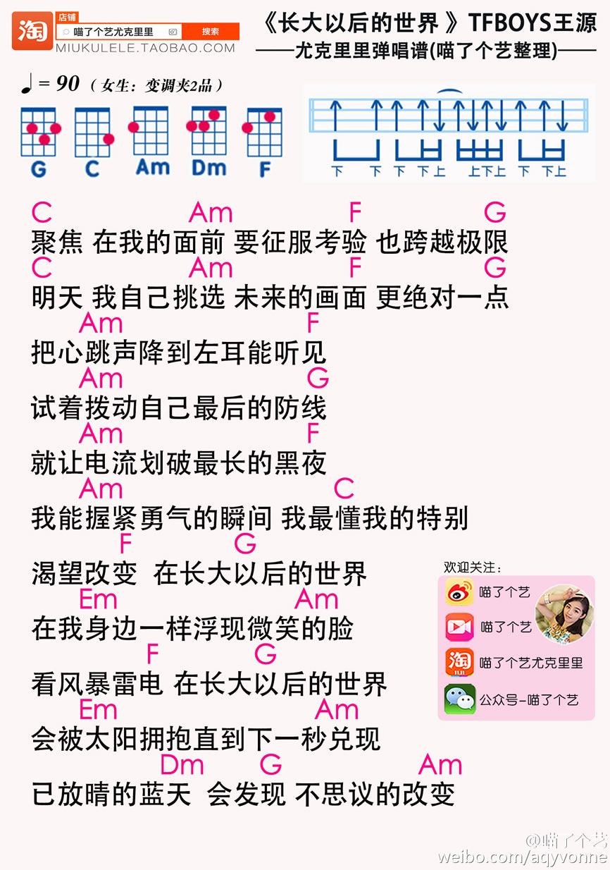 王源《长大以后的世界》尤克里里谱_王源ukulele谱 曲谱类型: 弹唱伴奏谱 编配来源: 喵了个艺 演唱(奏):王源 发布于:2016-11-09 点击: 次 曲谱归类: TFBOYS 长大以后的世界ukulele谱,TFBOYS成员王源演唱,长大以后的世界尤克里里弹唱谱,女生变调夹夹第二品。这首歌曲是林俊杰王源合作新曲。 * 网站内容自网络收集整理而来,仅供爱好者学习交流,版权归其原作者,若侵犯了您的合法权利,请与我们联系,我们将立刻处理。 上一篇:If You 尤克里里谱C调 Bigbang If you ukulele谱 下一篇:大王叫我来巡山ukulele谱_贾乃亮甜馨_尤克里里弹唱谱 优客张SIR 心动小U 马叔叔教乌克丽丽 鱼仔超人 玛佧音乐 四弦公社 小Sa神 ukulele狂热 强尼的乌克丽丽 摩卡音乐 尤克宝贝 小鱼吉他屋 弹吧小吉他 相关吉他谱 不完美小孩ukulele谱_TFBoys_尤克里里弹唱教学示范 青春修炼手册ukulele谱_TFBOYS_马叔叔尤克里里教学